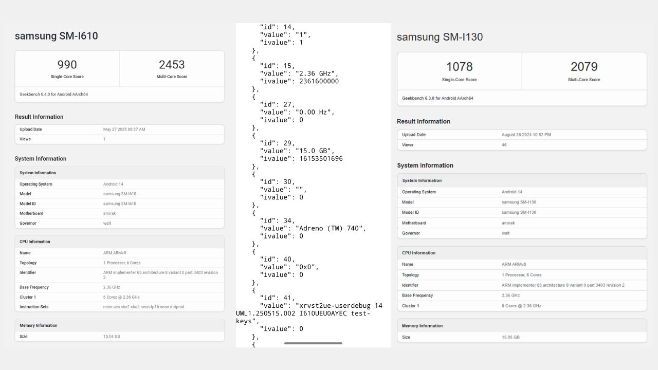 Второе устройство, SM-I130, предположительно относящееся к проектам Haean или Jinju, также построено вокруг Snapdragon XR2+ Gen 2 и Android 14. Несмотря на компактный форм-фактор очков, оно может сохранить примерно тот же уровень вычислительной мощности, что и Moohan. Однако на практике сокращение объёма корпуса и охлаждающих элементов обычно говорит о понижении частот или другом урезании конфигурации микросхемы.