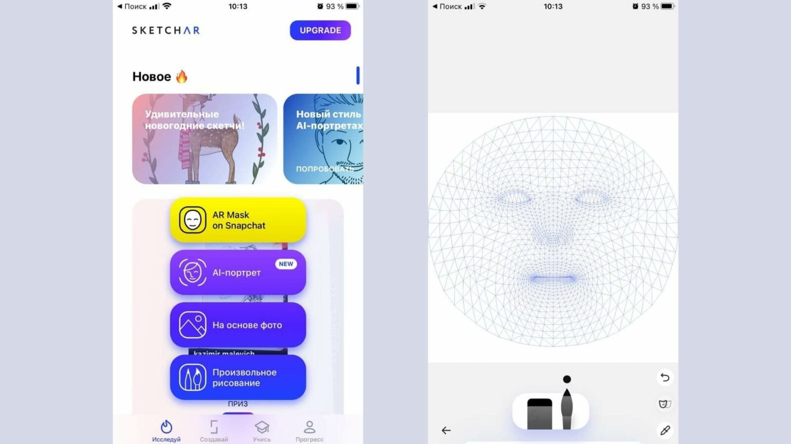 Редактор масок SketchAR позволяет создавать собственные «линзы» для Snapchat за считанные минуты. Чтобы проверить функцию, откройте приложение и нажмите кнопку «Создавай» в главном меню и выберите «AR Mask on Snapchat». Появится специальный шаблон, который можно медитативно заполнять, как картину по номерам. Затем можно попробовать маску и перенести её в Snapchat. Она также будет доступна вашим друзьям.