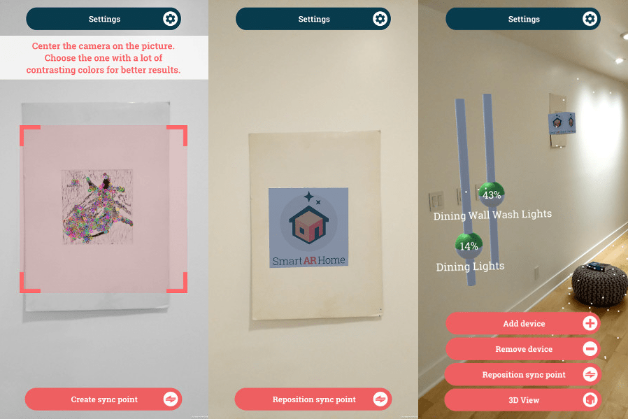 Для начала работы с приложением необходимо подключить его к совместимой смарт-системе в одной с ней сети Wi-Fi. Затем нужно установить «точку синхронизации» — некое зафиксированное плоское изображение или объект, при виде и относительно которого Smart AR Home будет вспоминать расположение всех расставленных вами виртуальных панелей управления. Отличной точкой синхронизации может стать картина на стене.