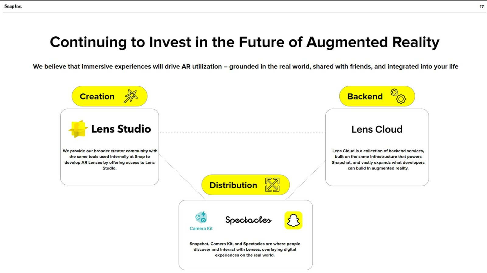 Snap продолжает вкладывать средства в основное приложение Snapchat, инструментарий разработки программного обеспечения Camera Kit и очки Spectacles. Но для последних финансовый поток мельчает, чтобы расшириться в области «высокодифференцированных долгосрочных исследований и разработок». Проще говоря, компания хочет больше интеллектуальной собственности и НИОКР, чтобы не потерять перспективу.