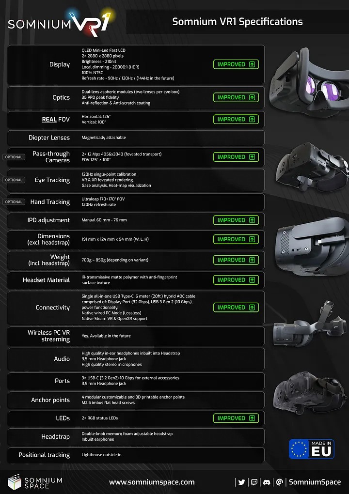 Аппаратным центром станут Somnium VR1. Сначала их представили как очки с возможностью автономной работы на процессоре Snapdragon XR2, но в прошлом году от этой идеи отказались, чтобы сосредоточиться на концепции устройства для персонального компьютера.