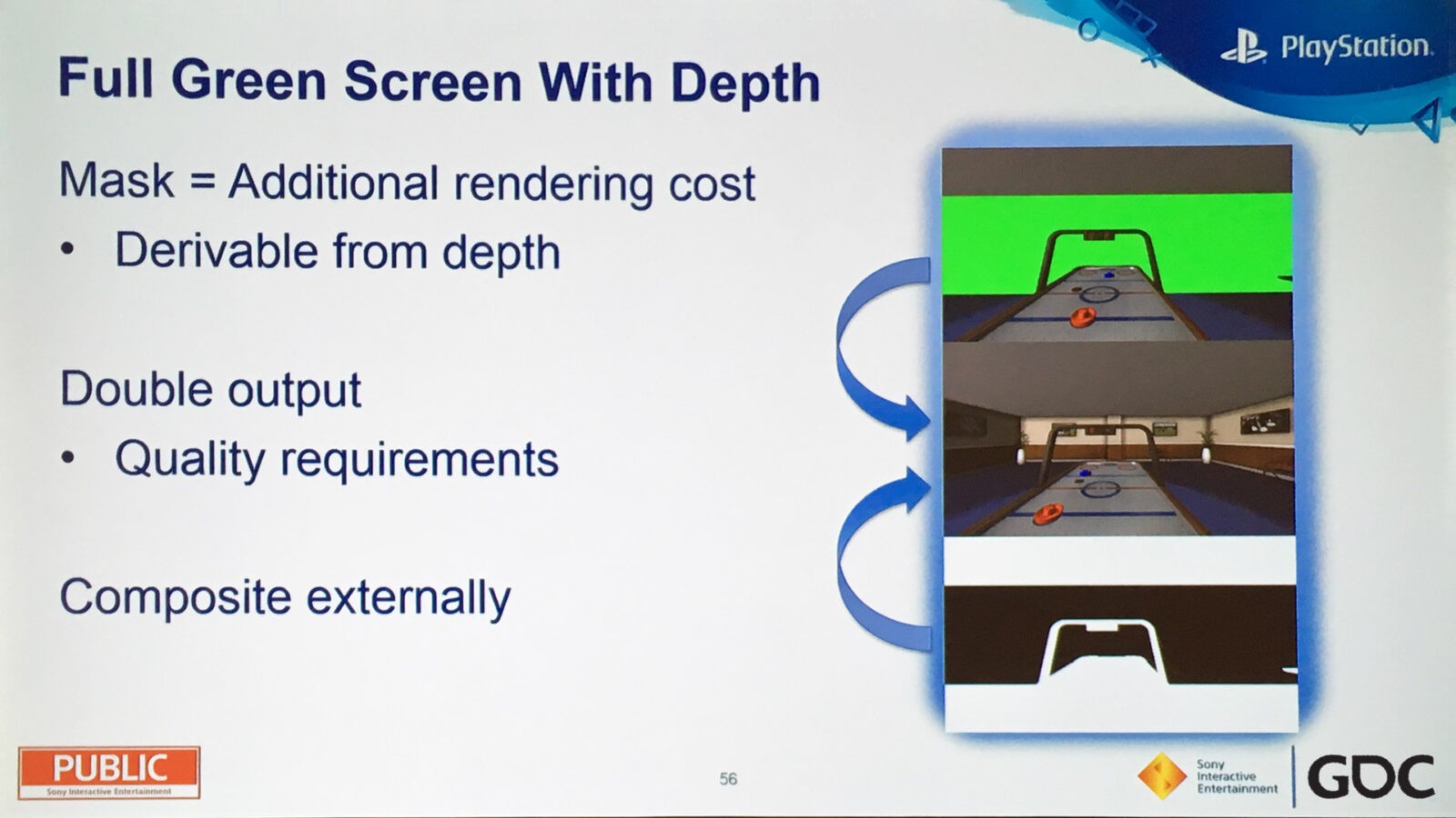 Команда также экспериментировала со смешанной реальностью, которая популярна в высококачественных трансляциях виртуальной реальности с ПК. Помимо простого создания композиции с зелёным экраном, можно применять «маски», благодаря которым игроки будут адекватно сочетаться с виртуальным окружением. Это потребует дополнительных вычислительных ресурсов и повлияет на скорость рендеринга. В таком сценарии для генерации выходного сигнала Форестер предлагает использовать вторую PS4 Pro с её поддержкой 4K и HDR.