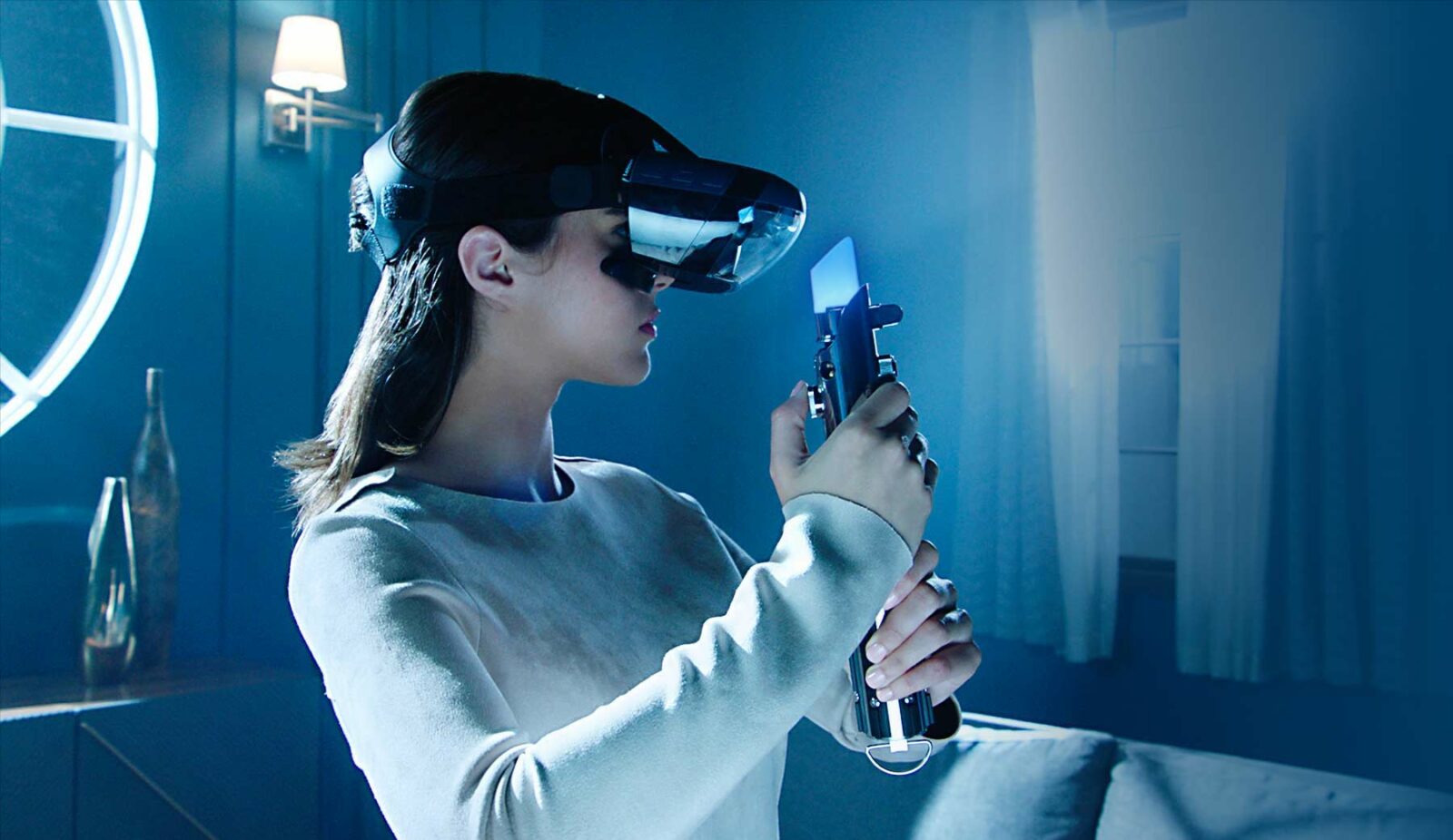 Более вероятно, что очки будут подключаться к смартфону без проводов или получат собственную вычислительную систему, став полностью автономными. Обратите внимание, что на видео проводов нет, а слева и справа от дисплея расположены объективы стереоскопической системы камер, которые в таких устройствах обычно используются для трекинга объектов и позиционирования очков в пространстве. Трекинг объектов есть: лазерный меч, который достаёт героиня ролика, будет задействован в игре.