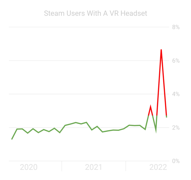 Несколько последних месяцев этого года Steam Hardware Survey показывал странные данные. К маю количество пользователей Steam с очками стабилизировалось около 2% от всех клиентов магазина. Но данные в мае 2022 года явили необъяснимый скачок до 3,24%. В июне было понижение, а в июле — взрывной рост до 6,67%. В августе — снова 2,6%.