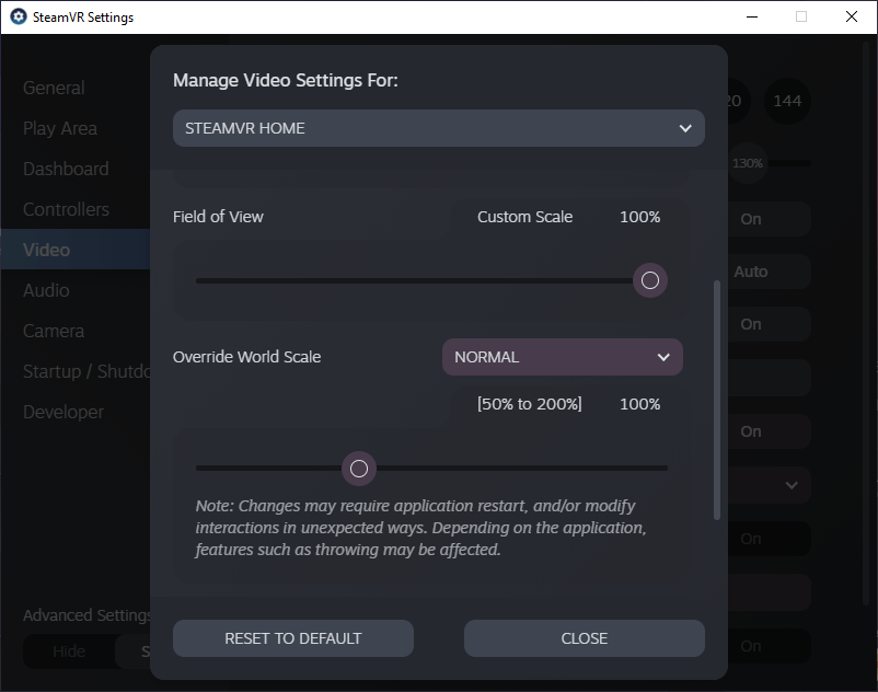 Разработчики также добавили две настройки рендеринга, индивидуальные для каждого приложения: «Угол обзора» и «Настроить масштаб мира». «Угол обзора» позволяет пользователям увеличить чёткость изображения, уменьшив область периферийного зрения. Параметр «Настроить масштаб мира» позволяет изменить воспринимаемый масштаб: например, чтобы подстроить под себя кабину пилота в самолёте или помочь низкому игроку достать до высоко расположенных предметов. Эта функция тоже перекочевала в основную ветку из недавней беты.