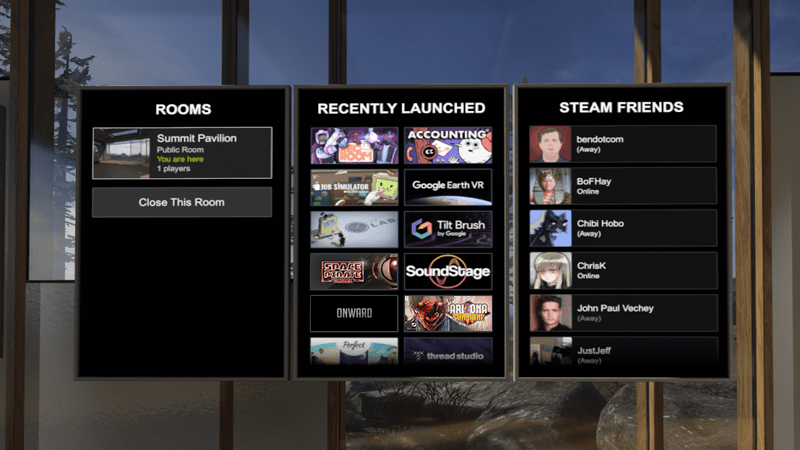 Домашнее пространство по умолчанию включает быстрые ссылки на ваши последние запущенные приложения, список друзей и доступные общественные или частные комнаты. Разработчики также получат доступ к этим панелям и смогут встраивать их в любую среду, которую создают.