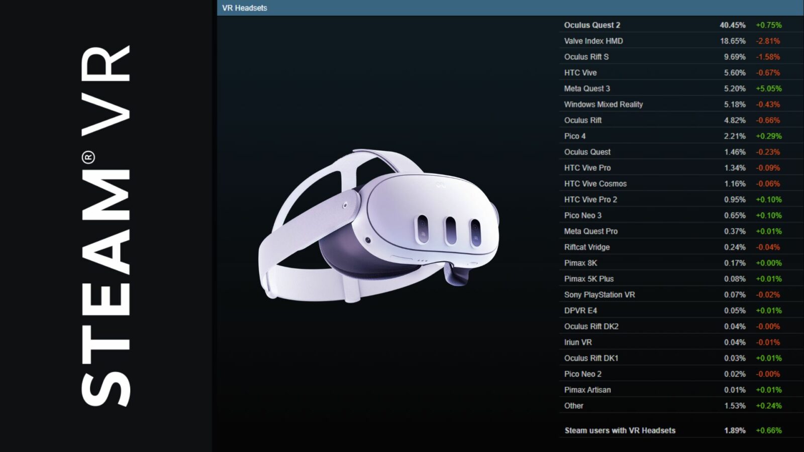 По занимаемой доле в общем количестве очков Quest 2 остались недостижимым лидером с 40,45%. За ними идут Index с 18,65%, неактуальные Rift S с 9,69% и Vive первого поколения с 5,6%. Quest 3, как упоминалось выше, замыкает пятёрку лидеров.