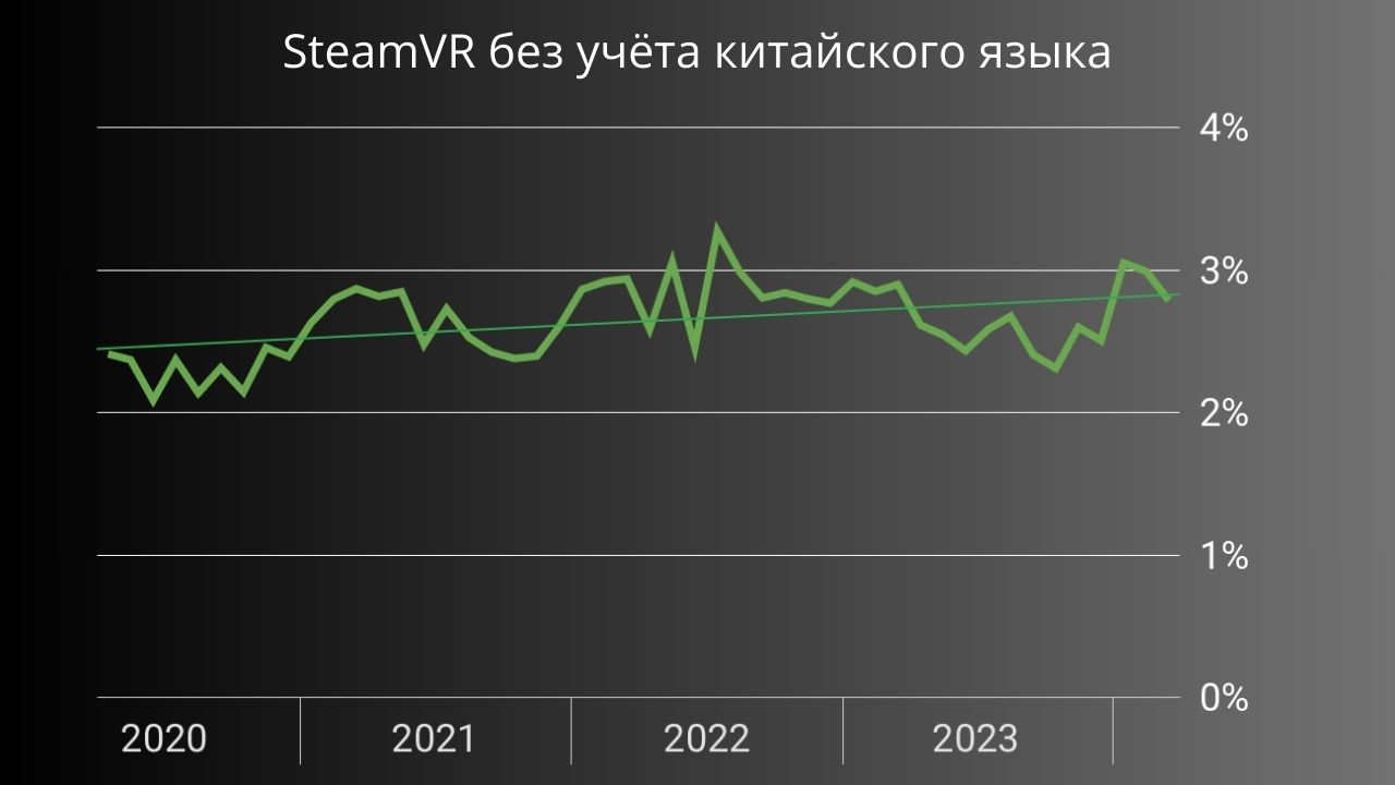 Если количество геймеров на ПК будет расти быстрее, чем количество пользователей виара, процент уменьшится, даже если виртуальная реальность станет популярнее. Это просто допущение, которое показывает потенциальную ошибку в логике оценки данных. На неё обычно накладывается ошибочное принятие Steam за весь рынок компьютерного софта, хотя это едва ли проблема, когда дело касается SteamVR, который стал стандартным средством работы с очками на ПК.