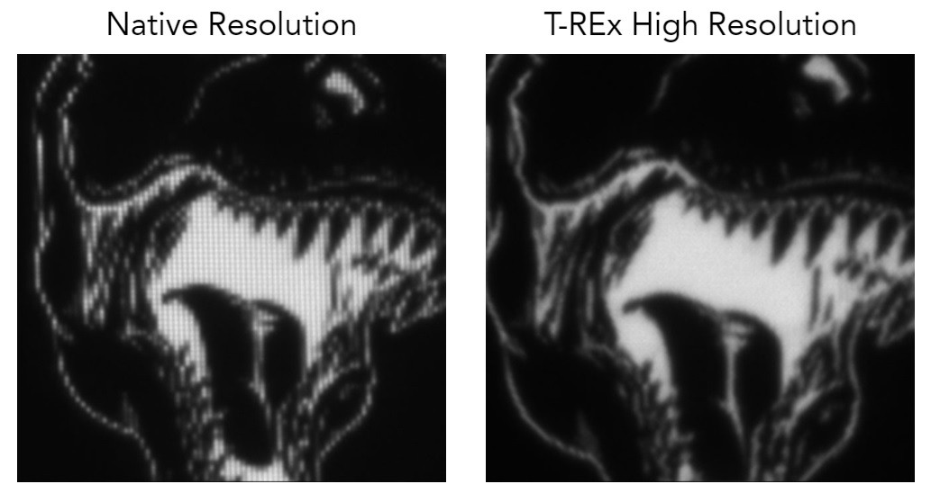 T-REx накладывает два последовательных кадра с небольшим смещением, так что пиксели одного кадра заполняют промежутки между пикселями в другом. Если делать это достаточно быстро, глаз не может различить, что кадры разные, зато видит больше деталей.