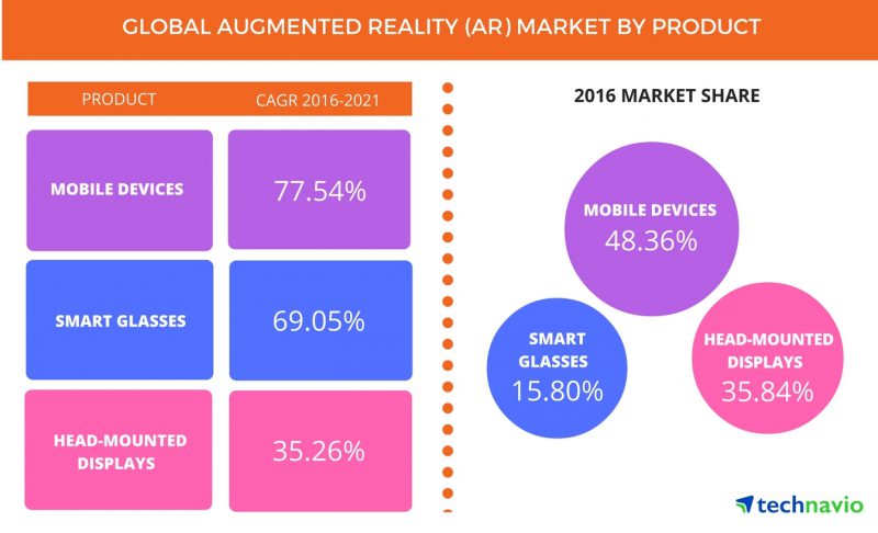 Анализ TechNavio учитывает три сегмента: мобильные устройства (фактически, смартфоны), очки и шлемы. Глобальный рынок дополненной реальности на мобильных устройствах должен показать рост в районе 78%, что связывается с выпуском ДР-приложений крупнейшими игроками ИТ-отрасли, такими как Apple, Facebook и Google. Процесс принятия не будет революционным: постепенно на рынке будут появляться новые смартфоны с камерами глубинного зондирования, контент под них будет развиваться и начнёт генерировать доход, дополненную реальность возьмут на вооружение компании, особенно из логистики и складского бизнеса. Ожидается, что постоянные новации смогут толкать рынок вперёд до 2035 года.