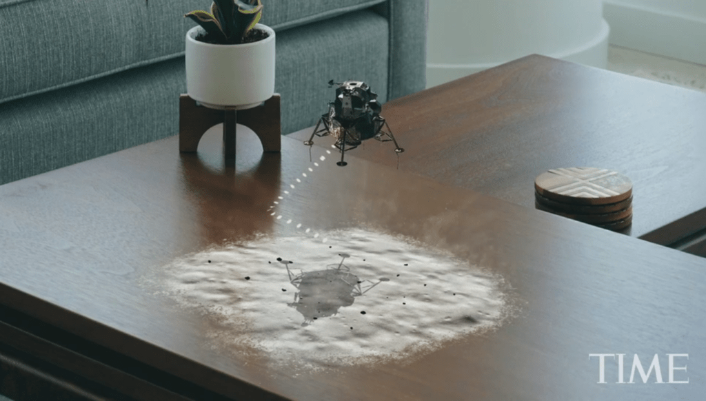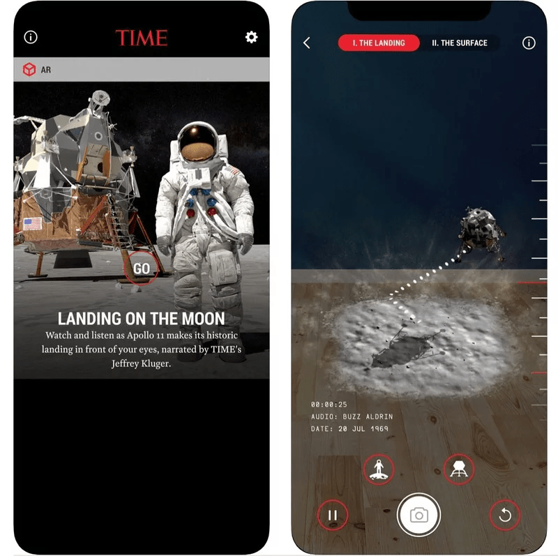 Первым проектом в TIME Immersive стала интерактивная визуализация в дополненной реальности на тему лунного подвига американских астронавтов «Landing on the Moon». Хотя качество графики оставляет желать лучшего, зритель, особенно неискушённый, сможет с удовольствием погрузиться в исследование миссии Аполлона-11, которую TIME постарался представить с сохранением исторической достоверности.