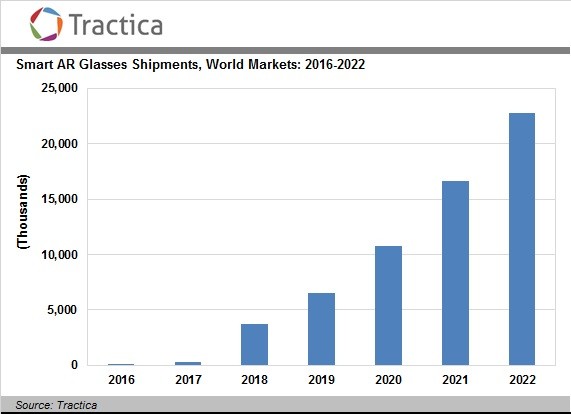 Маркетологическая фирма Tractica опубликовала новую порцию прогнозов по росту мирового рынка смарт-очков с функцией отображения дополненной реальности. По мнению её аналитиков, если в 2016 году все поставки таких устройств составили всего 150 000 штук, в 2022 году будет продано 22,8 миллиона штук.