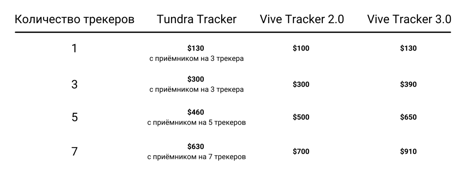 Ценовая сетка Tundra поначалу сбивает с толку. Дело в трёх разных USB-приёмниках, которые дают возможность соединять разное количество трекеров: