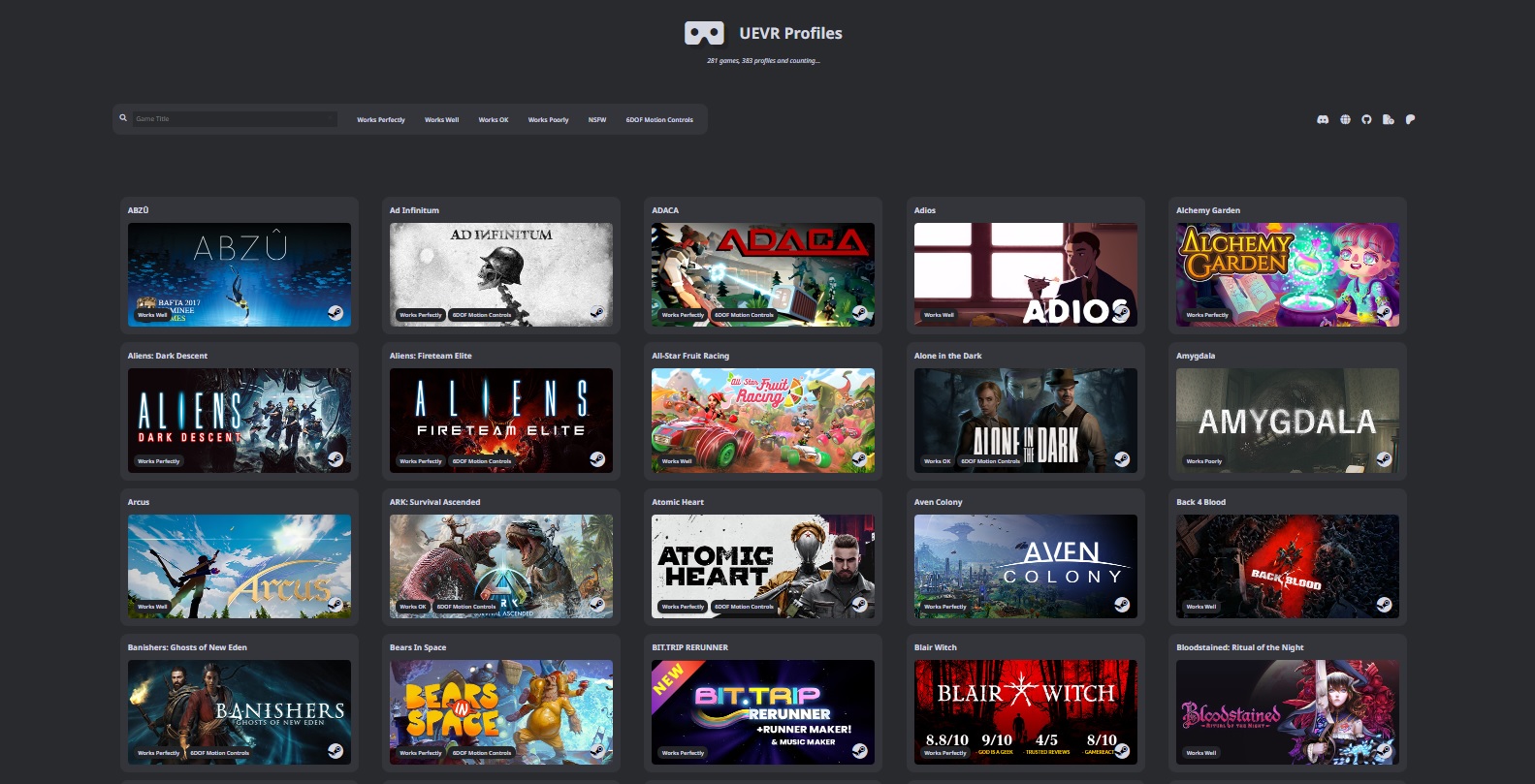 Сайт uevr-profiles.com от энтузиаста @Florent с Discord стал неофициальным каталогом игр, которые автоматически превращает в иммерсивные программное обеспечение фреймворк UEVR. После открытия на ресурсе 279 игр с разбивкой по качеству работы и наличию шестиосевого трекинга. Для каждой игры здесь собраны профили настроек, загружая которые пользователь сможет окунуться в то, что раньше от него закрывала плоскость экрана.