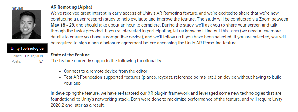 Представитель Unity Technologies под ником mfuad опубликовал на форуме движка сообщение, согласно которому компания проведёт сеансы исследования пользовательских предпочтений для оценки полезности и улучшения AR Remoting.