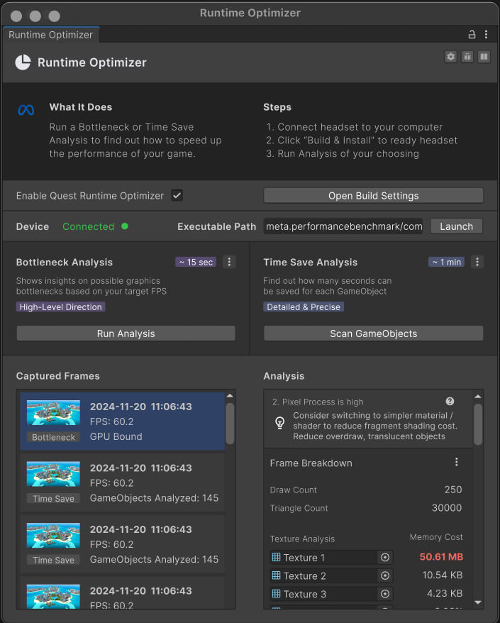 Meta* выпустила плагин Runtime Optimizer для оптимизации и исправления ошибок в Quest-проектах на Unity. Компания подчёркивает, что существующие инструменты RenderDoc и ovrgpuprofiler эффективны, но при этом сложны, а новинка сделана как раз для упрощения отладки. Это способ повысить качество массовой разработки, от которой во многом зависит судьба платформы Quest.