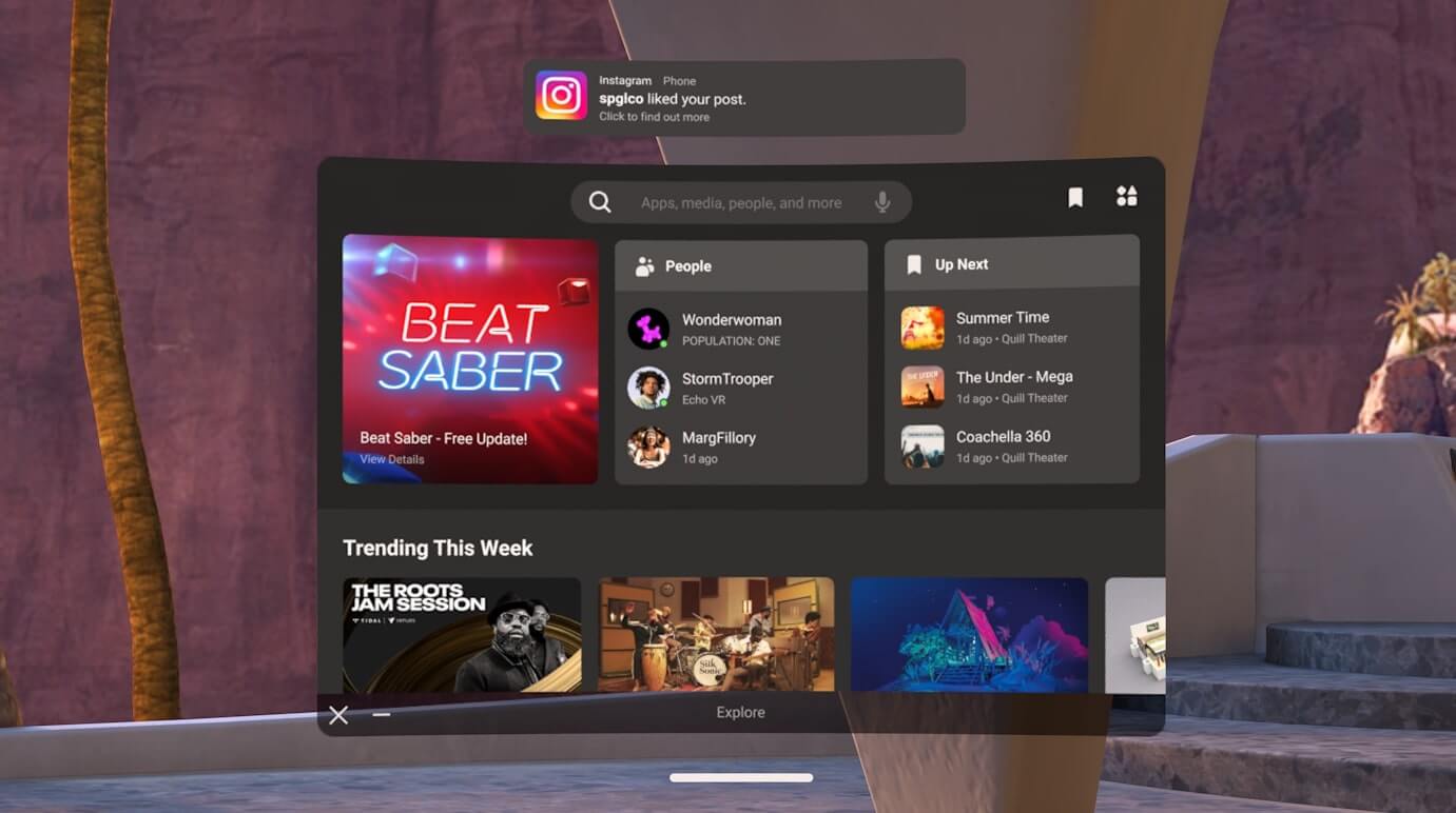 С обновлением v29 пользователи Quest смогли получать уведомления со смартфонов на Android. Теперь те же возможности открываются для Android. Для этого уведомления нужно настроить в смартфонном клиенте и включить там же или через меню самих очков. Очки будут показывать все уведомления, которые высвечиваются на заблокированном экране смартфона.