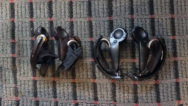 Новинка справаНа фото можно видеть, что ручка для захвата ладонью увеличилась, а крепление упростилось с перчатки до ремешка с затяжкой. Также заметны светодиоды системы трекинга, которые в серийных версиях гаджетов SteamVR прикрыты полупрозрачным пластиком.