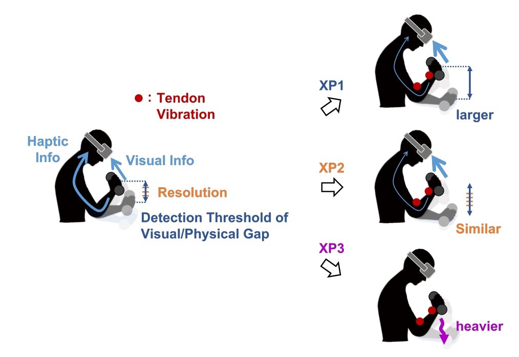 Японско-французская группа учёных представила исследование применимости вибрации для изменения ощущаемого человеком веса предметов в виртуальной реальности с визуальным контактом и без него. По словам авторов работы, вибрация в области сухожилий рук может увеличить воспринимаемый вес удерживаемого предмета — таким образом можно расширить спектр тактильных ощущений у пользователей ВР-очков.