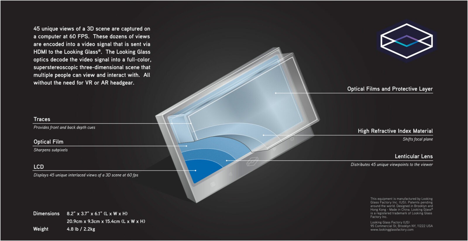 Решение Looking Glass Factory не имеет отношения к голограммам. С помощью патентованных технологий светового поля и объёмного отображения информации, а также продвинутого подхода к продуктовому дизайну стартап выпускает небольшое настольное устройство, которое способно показывать трёхмерную сцену с 45 углов при 60 кадрах в секунду.