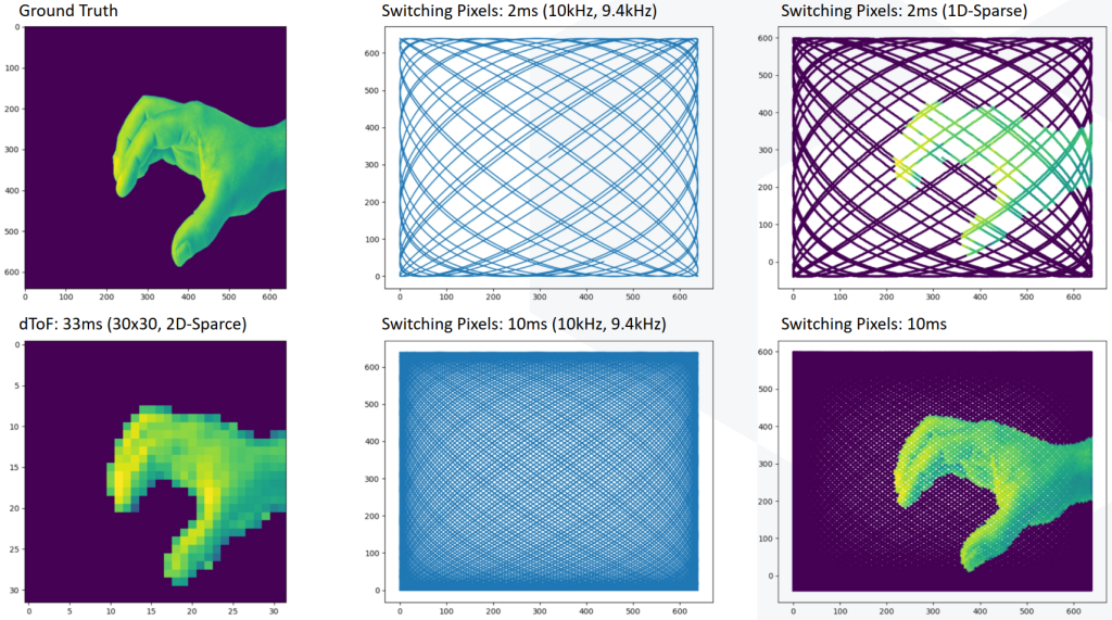 Два или более датчиков со Switching Pixels обеспечивают структурированную систему триангуляции на базе сканирующего лазерного луча, который быстро перемещается по сцене. Каждый датчик отправляет положение лазерного луча в AER (адресном представлении событий по осям x, y и времени) со скоростью до 100 мегагерц. На хост-платформе простой алгоритм триангуляции вычисляет точную трёхмерную форму, положение, контур и движение, создавая новый воксель каждые 10 наносекунд.