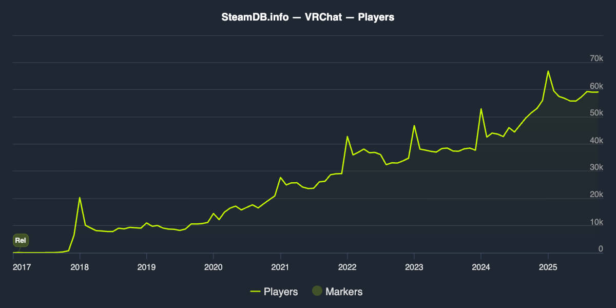Со стороны из-за сокращения ажиотажа вокруг виртуальной реальности могло показаться, что аудитория VRChat сжимается. Однако ажиотаж превратился в массовое использование, а сервис компенсирует скачки интереса к технологии поддержкой «плоских экранов».