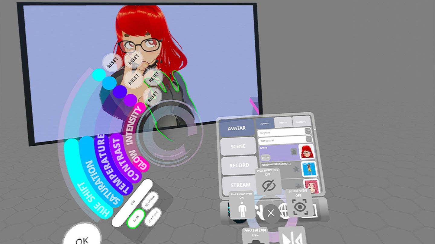 В стриме можно использовать аватары Meta, Ready Player Me и прочие аватары в формате VRM — том же, который работает в VRChat. В Quest Pro глаза и лицевая мимика аватара управляются специальными датчиками отслеживания глаз и лица. На Quest 2 и 3 такой технической возможности нет.