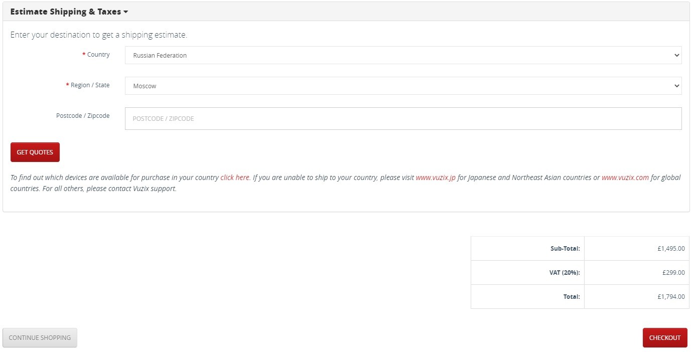 Судя по процессу оформления заказа в магазине Vuzix, резидентам России предлагают покупать новинку через британский офис компании по цене £1794 (около 171 500 рублей) с 20-процентным британским НДС и доставкой в Москву. Другие условия производитель пока не оговаривает.