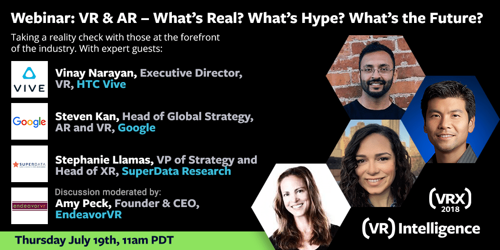 В рамках подготовки к саммиту VRX 2018 в Сан-Франциско компания VR Intelligence проведёт открытый вебинар «Что реально? Где хайп? В чем будущее?» («What’s Real? What’s Hype? What’s the Future?»). В вебинаре примут участие представители Google, HTC и SuperData.