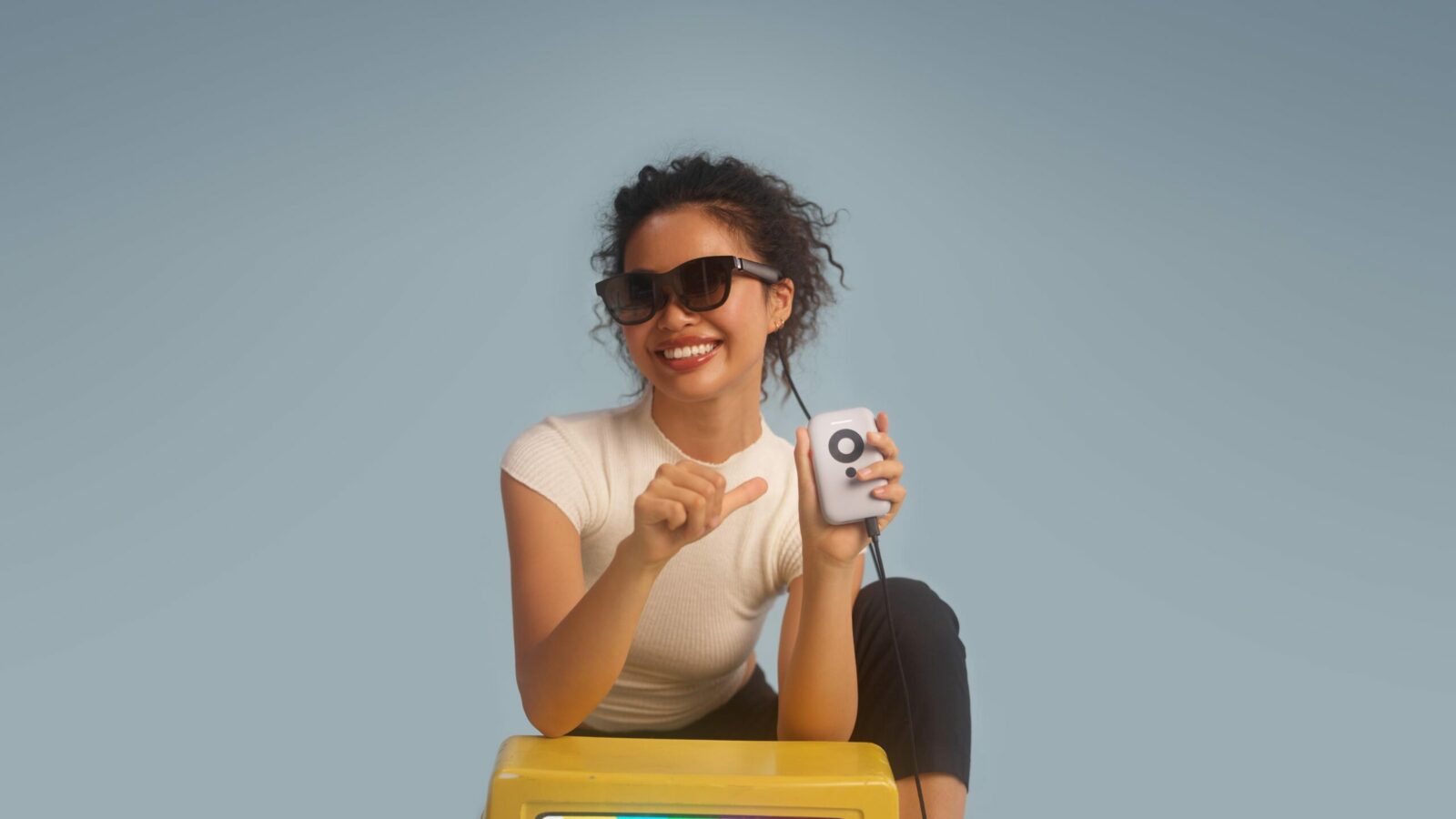 Beam, который сами разработчики описывают как «устройство в форме iPod», представляет собой переходник, который может подключаться ко внешним источникам изображения по проводу или без проводов и транслировать сигнал на очки Air. На небольшом блоке с размерами и внешностью старого плеера Apple расположены органы управления, вход и выход стандарта USB-C.