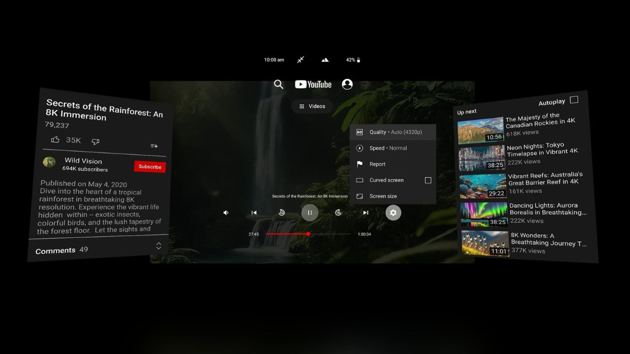 Свежая версия приложения YouTube VR для Quest 3 научилась воспроизводить видео в разрешении 8K при 60 кадрах в секунду. Обновление уже поступило в Quest Store. Это приносит новый уровень качества в потоковый контент на очках, где пиксели изображения размываются по всей внутренней части панорамы, и их нехватка остро заметна, но до сих пор оставалась непобеждённой в самом популярном в мире видеохостинге.