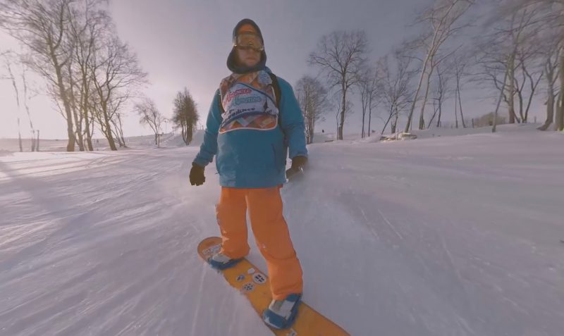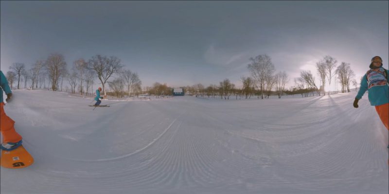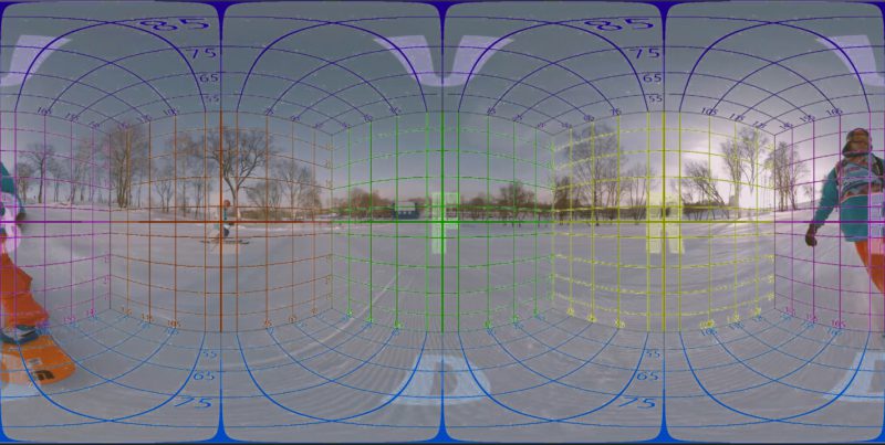По данному скриншоту можно понять, что сноубордист находится чётко сзади нас (B — Back), в то время как дом находится чуть левее самого центра, того, куда мы будем смотреть, когда наденем шлем (F — Front). L и R — слева и справа, U — Up, D — Down — то, что мы видим сверху и снизу. Очень полезный инструмент, советую использовать Equirectangular Grid в своей работе для понимания, в какой зоне что находится. Искажаемое обратно плеером видео в итоге отображается в привычном вам формате. То есть, это вы видите спереди: